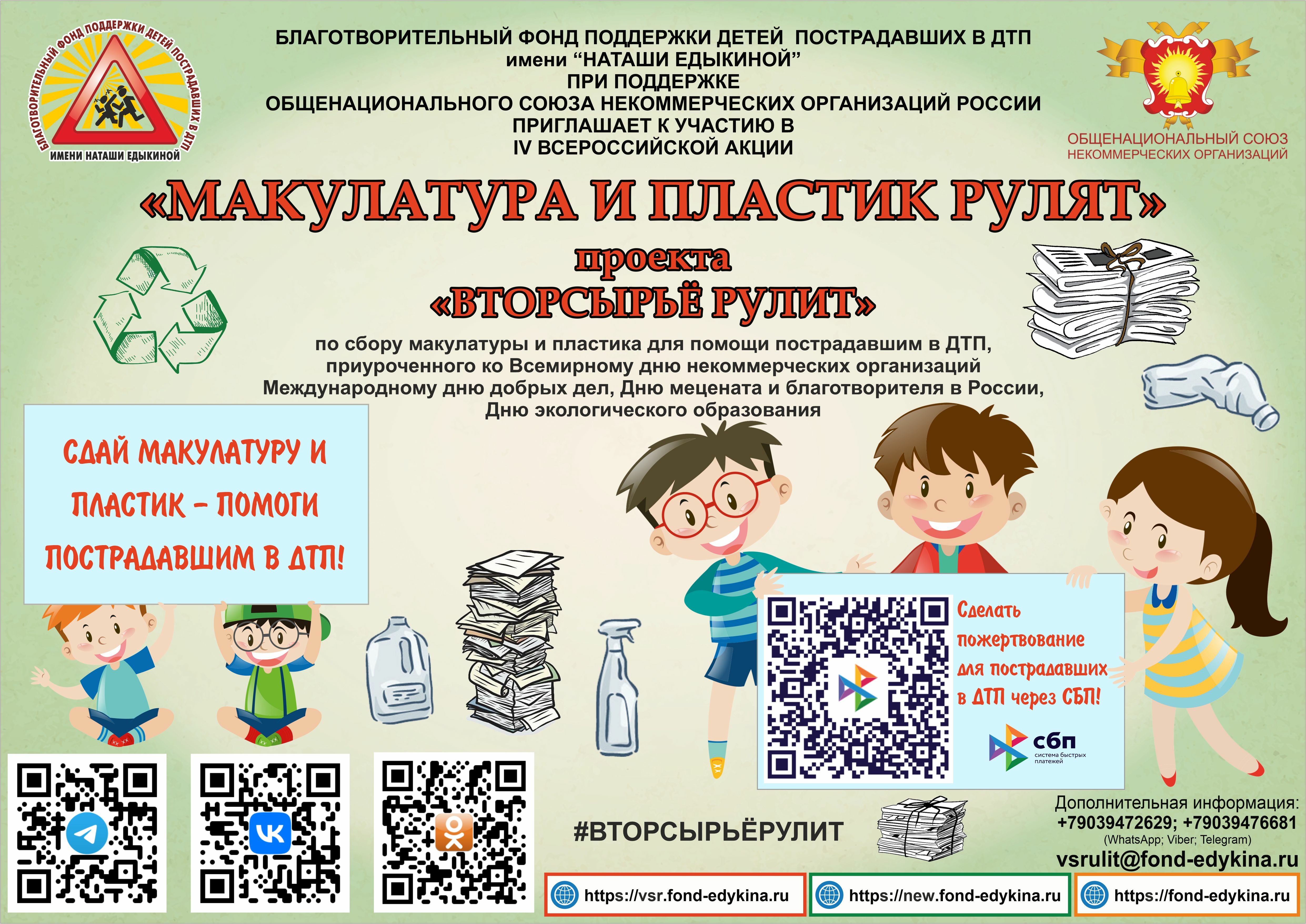 Благотворительный фонд поддержки детей пострадавших в ДТП имени «Наташи Едыкиной» приглашает принять участие в IV Всероссийской акции «Макулатура и пластик рулят» проекта «Вторсырьё рулит» по сбору макулатуры и пластика для помощи пострадавшим в ДТП. Акция проходит с 25 февраля по 25 мая 2025 года.